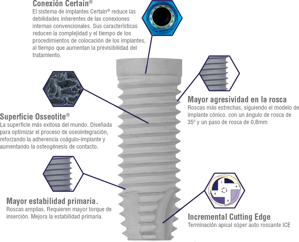 Con un innovador diseño, el sistema de implantes Certain® reduce las debilidades inherentes de las conexiones internas convencionales. Sus características reducen la complejidad y el tiempo de los procedimientos de colocación de los implantes, al tiempo que aumentan la previsibilidad del tratamiento.
